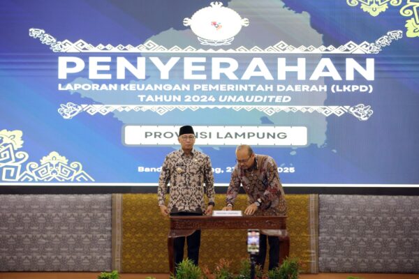 Bandar Lampung, Pdnewss.com — Gubernur Lampung Rahmat Mirzani Djausal menyerahkan Laporan Keuangan Pemerintah Daerah (LKPD) Unaudited Tahun Anggaran 2024 kepada Badan Pemeriksa Keuangan Republik Indonesia (BPK-RI) Perwakilan Lampung untuk mendukung kelancaran proses audit sesuai ketentuan perundang-undangan, di Auditorium Kanwil BPK-RI Provinsi Lampung, Bandarlampung, Kamis (27/3/2025).
