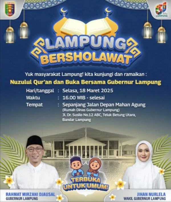 Bandar Lampung,Pdnews.com – Gubernur Lampung Rahmat Mirzani Djausal dan Wakil Gubernur Lampung Jihan Nurlela mengundang masyarakat untuk hadir dalam peringatan Nuzulul Quran sekaligus buka bersama di Mahan Agung, Jalan Dr. susilo, Teluk Betung Utara, Bandar Lampung. Berdasarkan undangan yang tersebar di grup Whatsapp, acara tersebut dijadwalkan pada Selasa, 18 Maret 2025, mulai pukul 16.00 WIB sampai dengan selesai.
