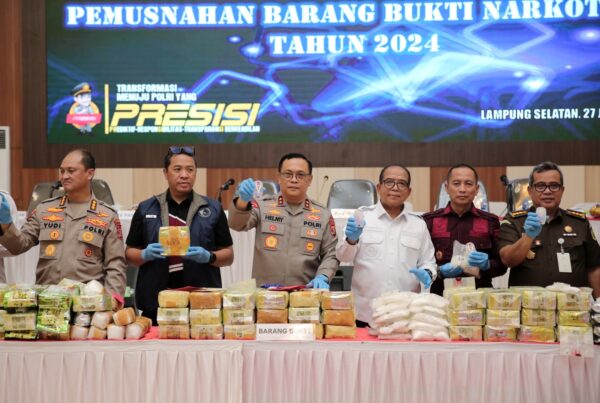 Lampung Selatan, Pdnewss.com – Pj. Gubernur Lampung Samsudin dan Kapolda Lampung Irjen Polisi Helmy Santika melakukan Pemusnahan Barang Bukti Narkotika Hasil Sitaan Polda Lampung Tahun 2024, yang dilaksanakan di Gedung Serba Guna Presisi, Mapolda Lampung, Lampung Selatan, Kamis (27/6/2024).