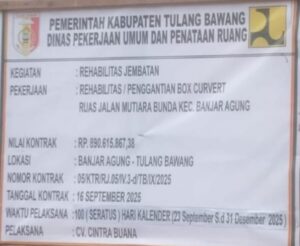 Berdasarkan papan informasi Proyek jembatan antara dua kampung tersebut, ditargetkan rampung dalam waktu 100hari kerja tercatat dalam 23 September sampai dengan 31 Desember 2025, dengan nilai kontrak Rp.890.615.867.38 ( Delapan ratus sembilan puluh juta enam ratus lima belas ribu delapan ribu enam tujuh tiga lapan rupiah) dikerjakan oleh Cv.Citra Buana.
